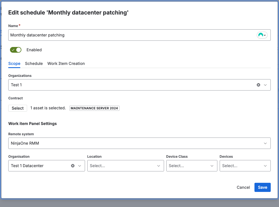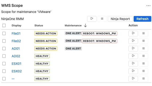 We support IT service providers and MSPs during monthly system patching activities by providing transparency on the assets in scope, as defined by the schedule. For NinjaOne, this includes device state, as well as a direct link to the server. In addition, you can put e.g. all devices into maintenance mode with a single click.